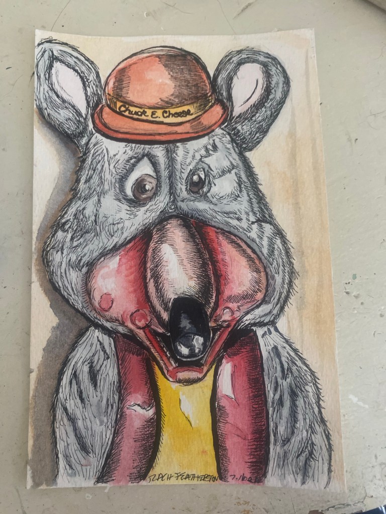 Friday was a milestone birthday for me! I used to love to go to Chuck E. Cheese in the 80s! I drew my beloved mascot. Original Artist: Rach Featherston, 2021. Pen and ink with watercolor, 5×7.