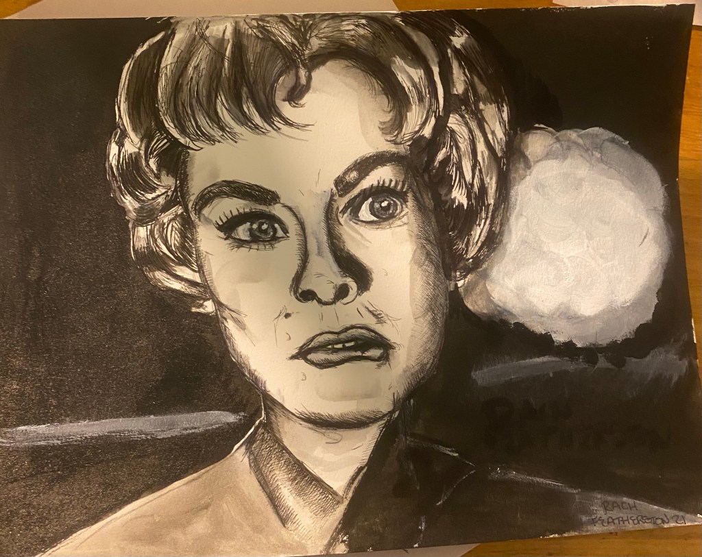 Another addition to the Scream Queen theme, Marion Crane played by Janet Leigh from the 1960 film, Psycho. Artist: Rach Featherston, 2021. Ink and pen on 9×12.