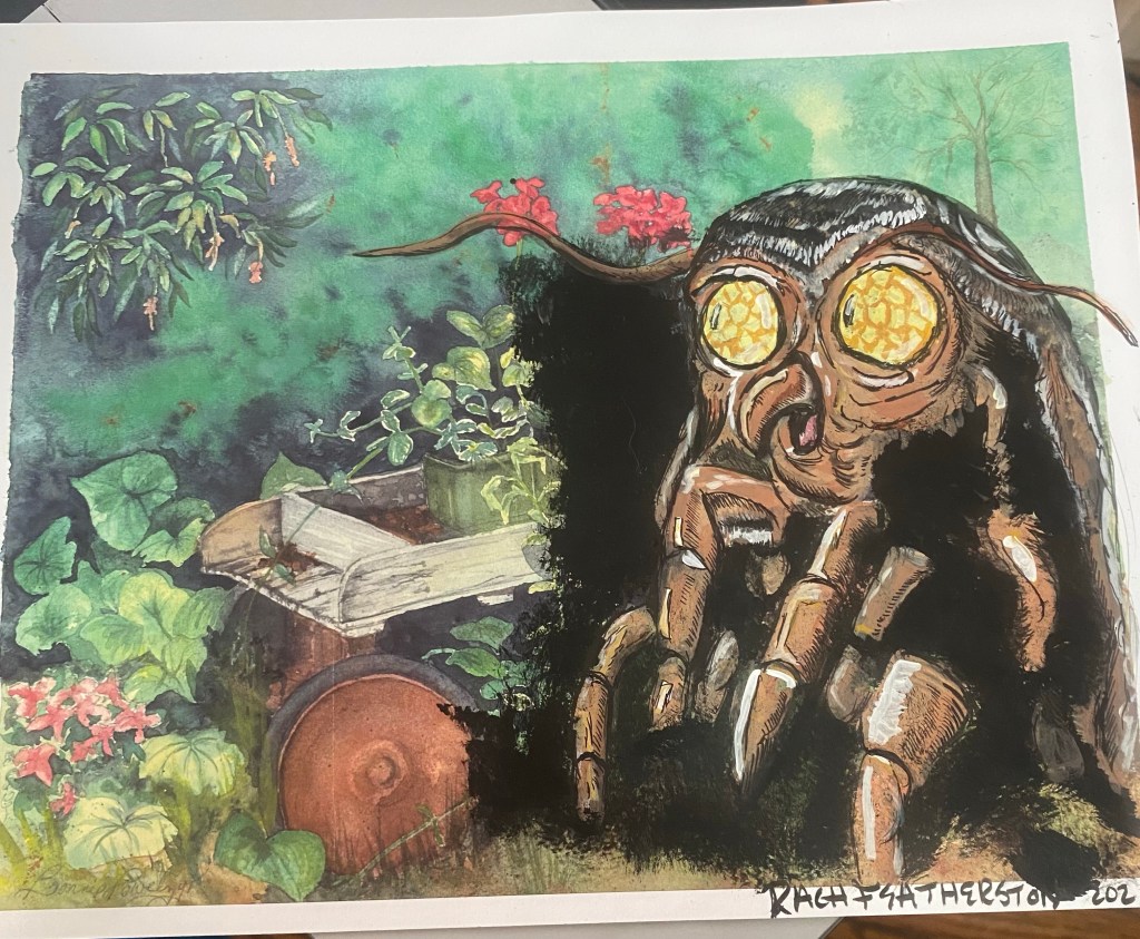 Once a month, I hold a painting night on Discord that is mainly Fallout themed. This month, we created the Mothman. I thought it be fun to find a mass produced piece of art you would find in box stores. I went to a thrift store and spent an hour looking for one that would work for the Fallout 76 locations. 5 minutes before the store closed, I stumbled upon an 8×10 watercolor print of an old cart in the woods. Perfect! It is signed and dated 1997. I spent time trying to find the artist but they don’t exist. We assume it is a fake factory name. I added the Mothman. He is gouache paint with ink, Repurposed art by Rach Featherston, 2021.