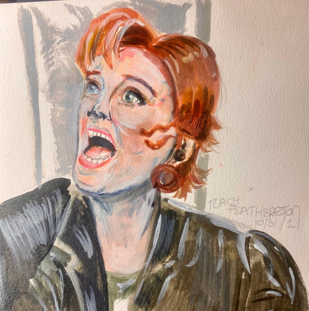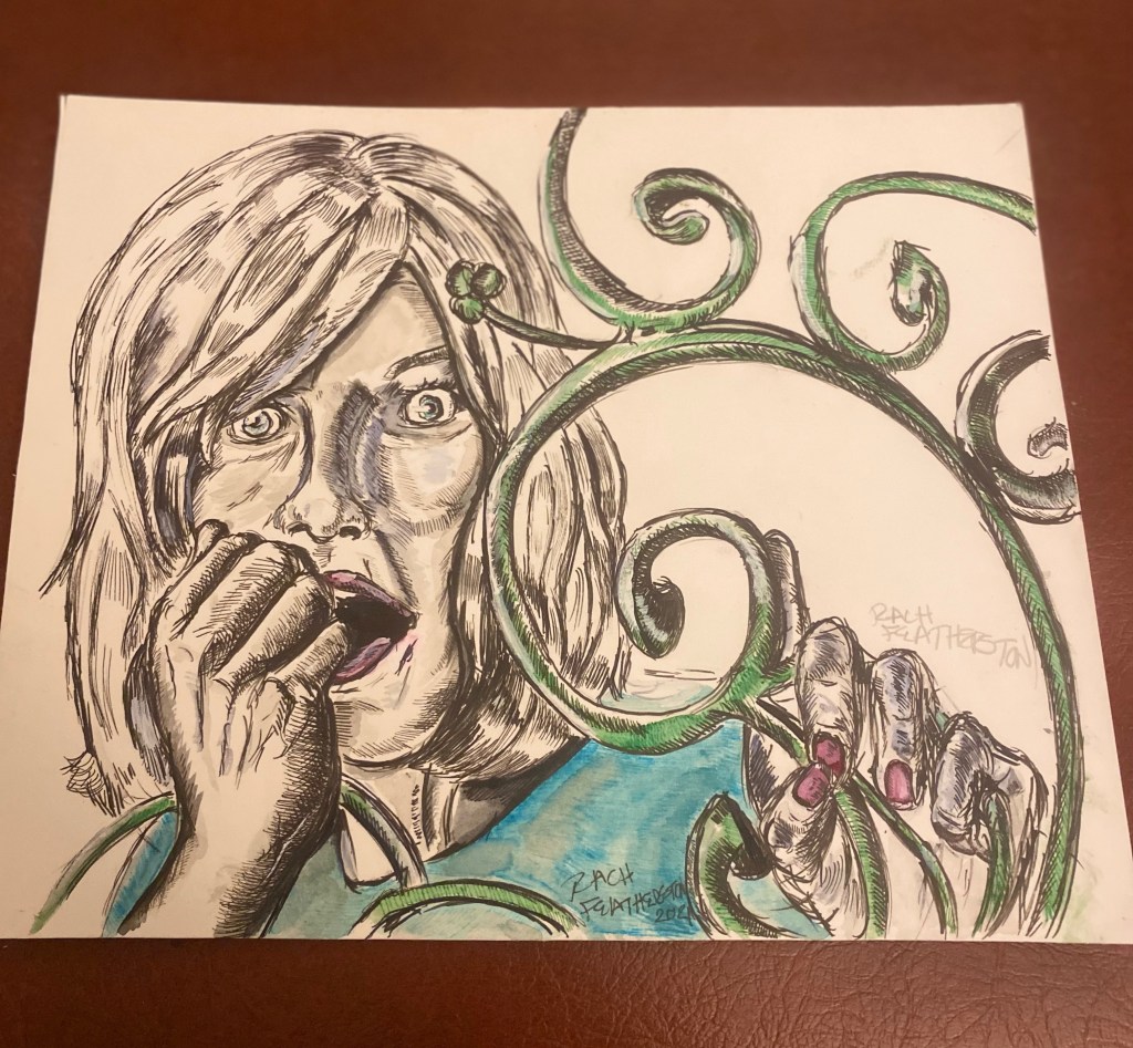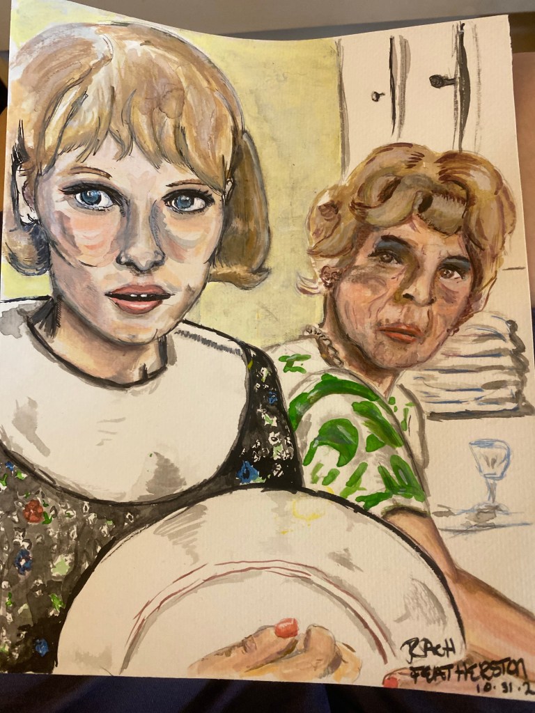 Mia Farrow and Ruth Gordon from Rosemary’s Baby. 8×10 pen and ink. Artist: Rach Featherston Loosely based on Dementia 13. 8×10 pen and ink, artist: Rach Featherston Catherine O’Hara playedDelia Deetz in Beetlejuice! 8×10 pen and ink Artist: Rach Featherston, 2021Every Halloween I have to carve pumpkins while watching the film. This was a commission of Nancy Kyes who played Annie for a dear friend. 8×10 watercolor, pen and ink. Artist: Rach Featherston, 2021Yes. It is Dante’s Inferno from Beetlejuice, but I personalized it to make my brother’s birthday card. Pen and ink 8×10, Rach Featherston, 2021