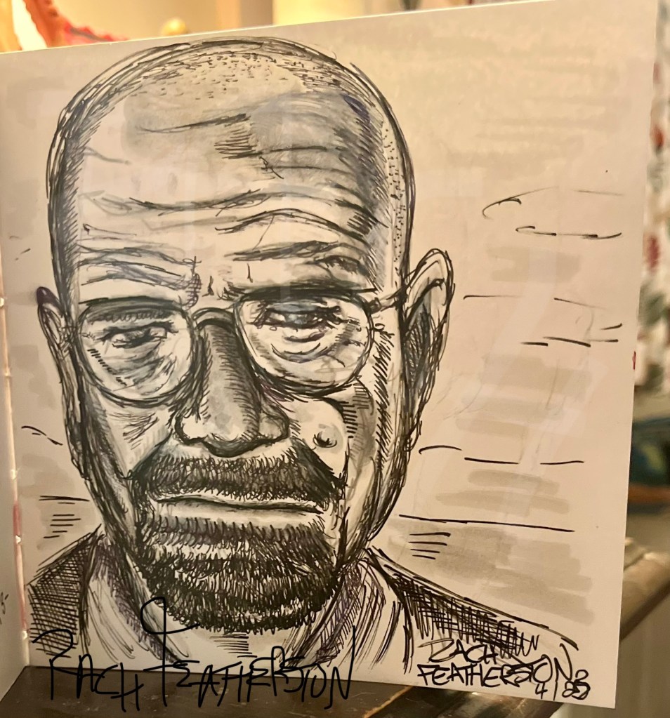 I kind of missed the whole Breaking Bad craze, so I’m catching up now. Instead of going to bed at a decent hour, at 10:45pm while in the middle of season 2, I decided to draw Walter White. Walt was played by Bryan Cranston. 25 minutes later, we have a finished piece in my new sketchbook! Pen and Ink on Bristol paper. Art by Rach Featherston, 2023