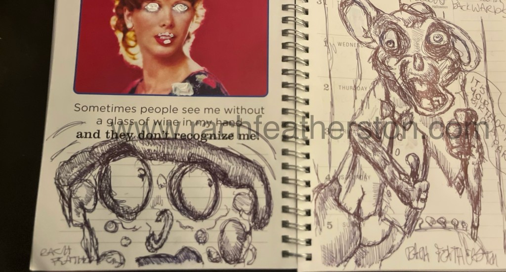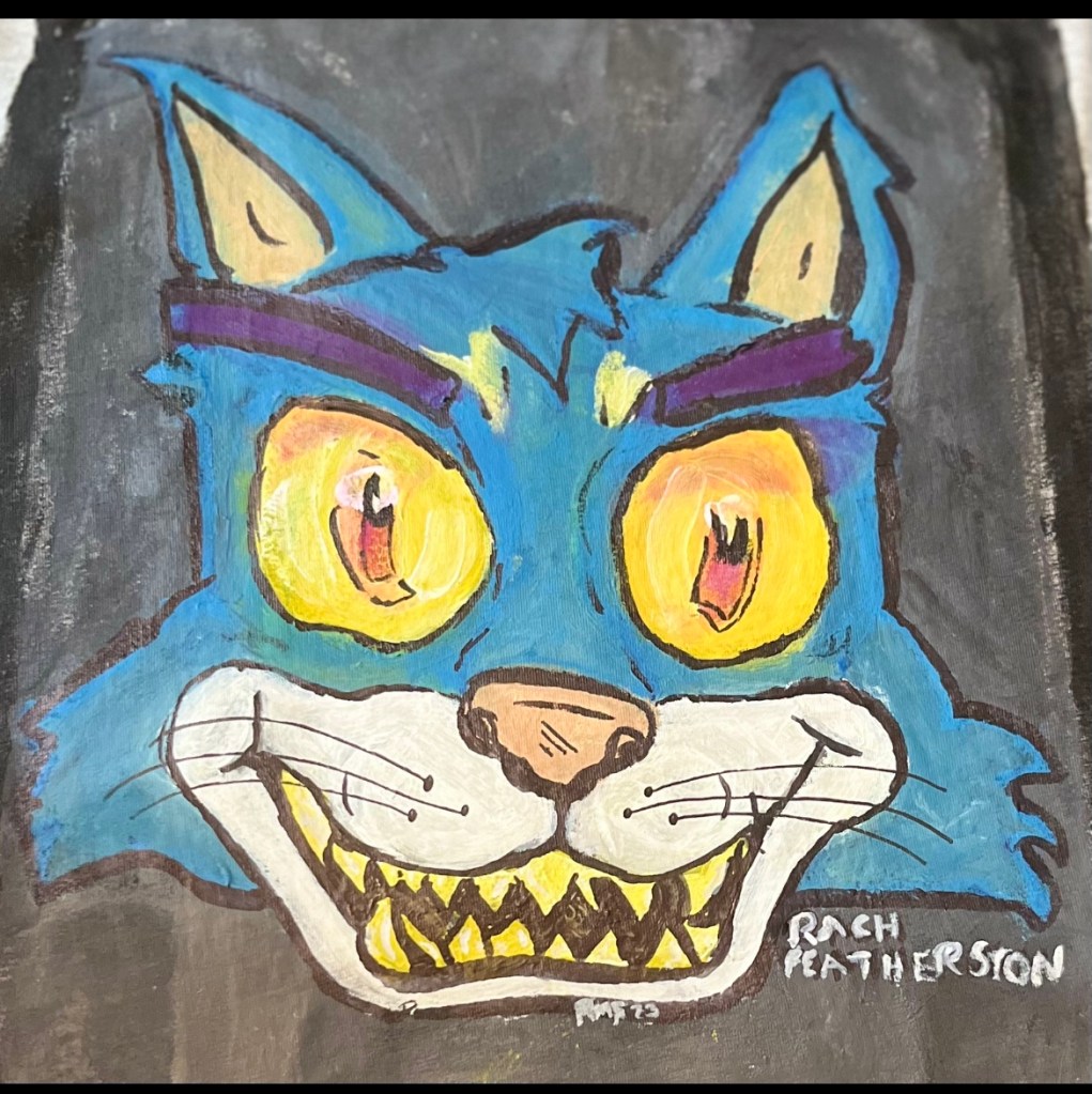 Dimas Kitty is the mascot for my art discord and named after a dear friend who passed away. was created on the first paint night held 3 years ago. The original paint nights were alcohol fueled and we were making cute versions of Fallout’s Mr. Fuzzy. After 2 bottles of wine I failed this art session and made my piece into this guy. The only thing I got right is the blue!